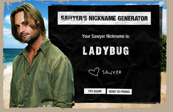 You know how Lost‘s Sawyer gives all the characters nicknames on the show? Well, ABC has made a little Sawyer nickname generator, obviously pimping the new (and still excellent) fourth season. I thought I’d try it out out as a way of sharing this little web-gem with you all, and here’s what that fuckface Sawyer has decided to name me: