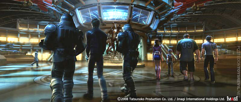 When a few pics of the upcoming CG Gatchaman movie came out last week, I bitched because hardly any of them showed the characters in costume. Well, someone was listening to me botch, because ToysREvil has a few new concept art pics, which show the five-man team of teenage psychotics, albeit it not in costume. There’s a lot to like about both pics; the upper one does a great job of conveying Joe as the bad boy, what with his leather jacket and being led away by police, and as TRE himself notes, it’s very cool that Tiny is genuinely huge instead of obese, as per the original anime.