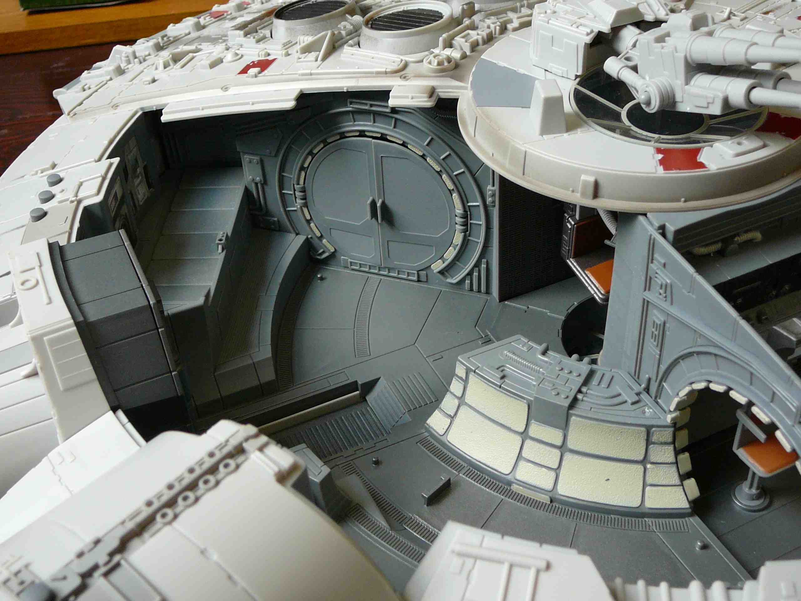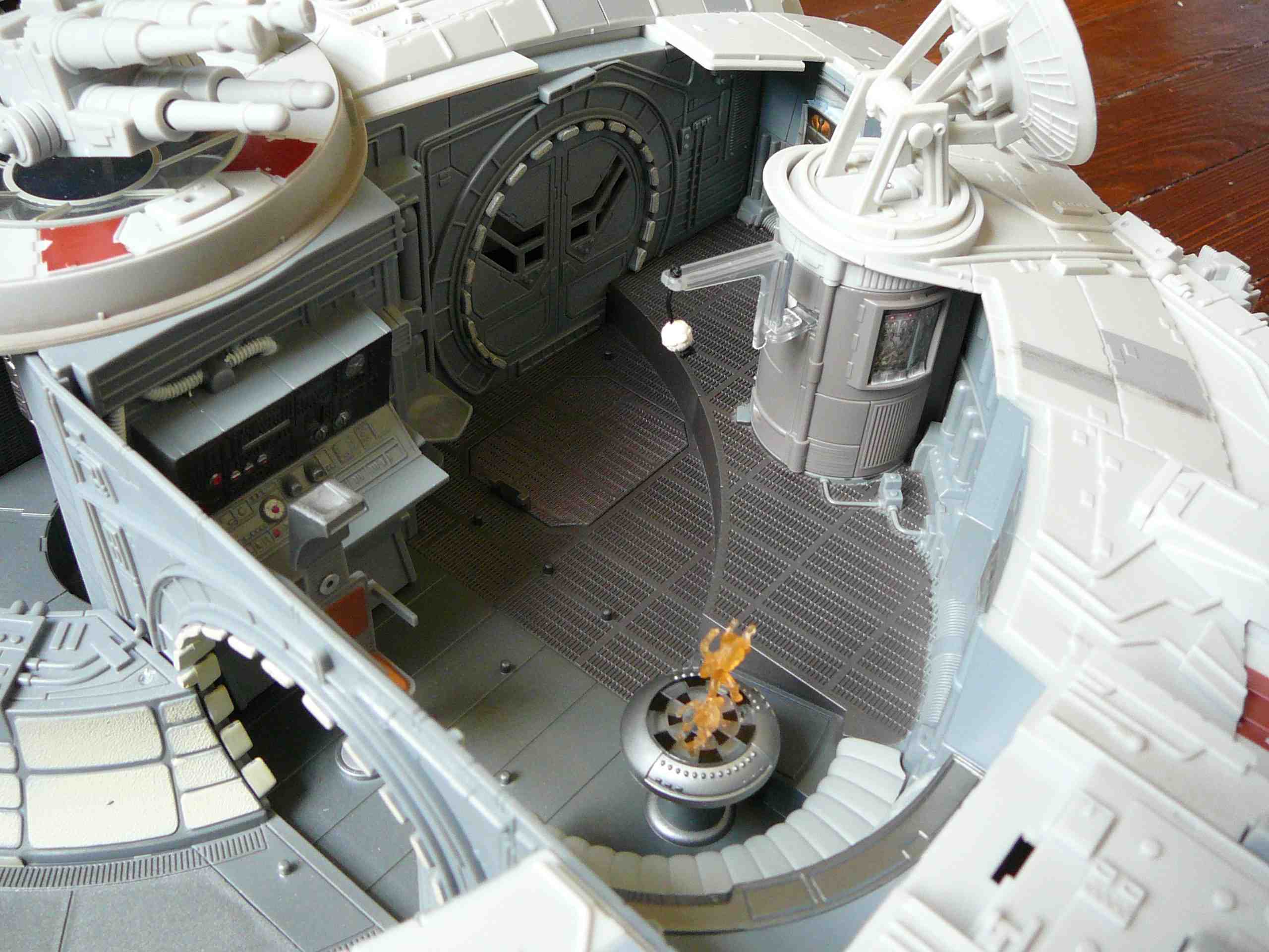 There are two main areas in the interior (besides the cockpit), which each have their own separate cover panels. The first contains secret smuggling compartments, which appears to have room for four figures. This area also includes the boarding ramp (more on that in a sec), the medical bay where sisters can tend to their hand-challenged brothers, access to the laser cannon (which Han and Luke use to kill themselves some TIE Fighters in ANH), and a doorway which leads to a decent sized storage room.