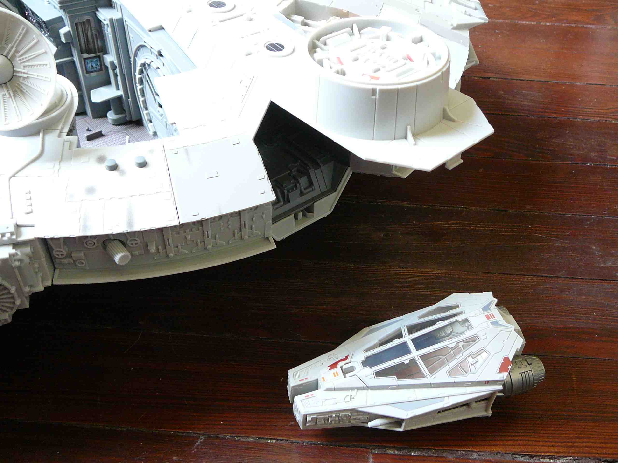 Let?s begin with the size. This thing is huge. Huuuge. The box says it?s over 2 ? feet long, and its not lying?this Falcon is so damn big the two pointy bits are separate and have to be attached, because otherwise the thing wouldn?t fit in the already mammoth box. Frankly, I have no idea how a small child could possibly play with this thing, because it would be nearly impossible to lift. It?s longer than the Royal Naboo Starship, and it?s much wider, for you Star Wars toy nerds.