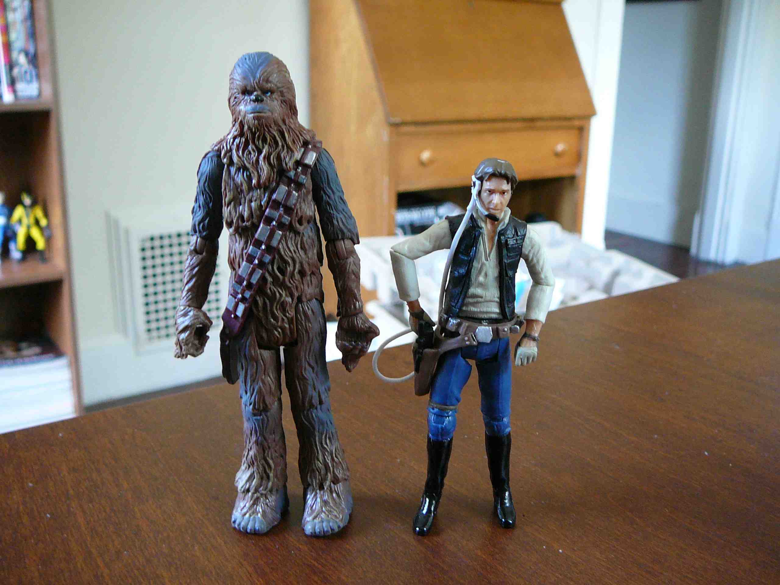 The Falcon comes with two figures?a preposterously articulated Chewbacca and a Han with his headset he uses to talk to Luke in the gunner?s seat. I don?t know if this Chewbacca is a re-release of a previous Chewie figure, but it?s absolutely the best Chewie I?ve ever seen. Besides all the arm and leg joints, he has two joints in his torso, allowing him to duck down under the Falcon?s doorways! Amazing. As for Han, I?m a bit torn?you can?t remove the headset, and I?d certainly prefer a Han without it. But since most collectors already have a regular Han (or 12), having him with his headset is probably nice for them.