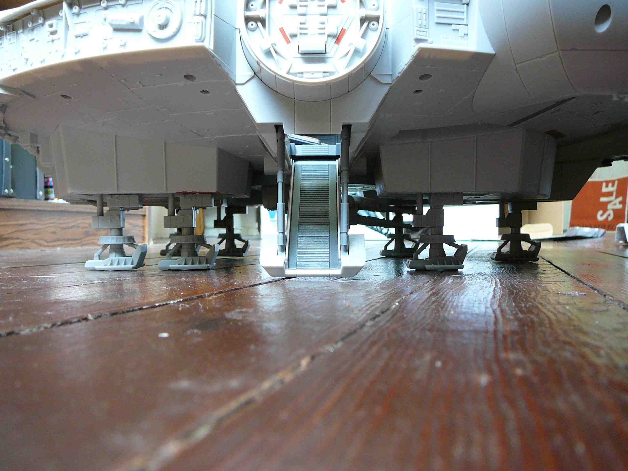 I think it?s important to note that the Falcon looks absolutely beautiful. The sculpting is spot on, and there?s a good many paint applications, including some very nice airbrushing. There are zero stickers that need to be put on (the outside, at least) to make it look nice. This was always my biggest problem with the early SW toys, because the stickers would peel off and my X-Wing would look like hell. There are 30 stickers to put on, but they all belong inside. Unfortunately, because the Falcon is so damn big, it can be tough applying them.