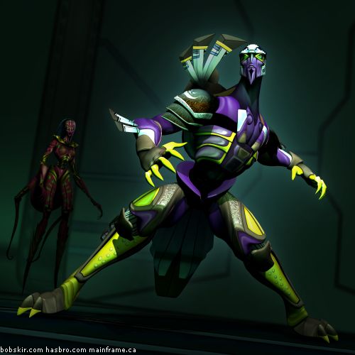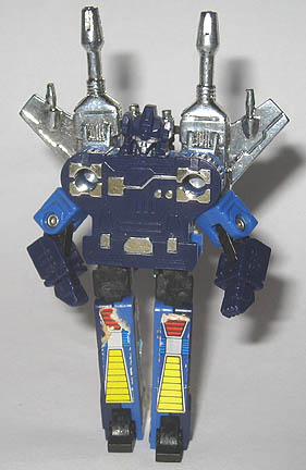 Boy, does Hasbro like to repaint its Transformers toys and sell them as different characters! During the early years of Transformers, they would even release several different versions of the same toy at once, dressed up as different characters. A good chunk of the early Decepticon force was made up of a jet fighter robot, sold with different decos as Starscream, Thundercracker and Skywarp. When Hasbro decided to release the toy as yet three more Decepticons, albeit with different-styled wings for each new character, the producers of the cartoon decided they has to do SOMETHING to differentiate the new characters from the three original seekers (as they?re called by fans) and the horde of background characters sporting the same design that had been shown in the cartoon. This was done by drawing the three new Decepticons?Ramjet, Thrust and Dirge?with their jet nosecones on top of their heads, a neat idea that worked wonders in making them look different. Kids, of course, wanted to do the same thing with the toy versions of the characters but found that leaving the nosecones up made the fearsome Decepticon air warriors all resemble Beldar Conehead, since the nosecones couldn?t shrink down like they did in the cartoon. Hasbro would release properly-coned versions of the characters in the 2007 Transformers Classics line, although Dirge and Thrust were only available in a very limited and now insanely expensive Botcon exclusive boxset.