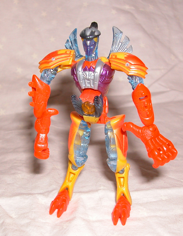 Silverbolt was a lovable character in the Beast Wars cartoon, a heroic Maximal who was too noble for his own good, and chivalrous to the point of hilarity. He also could turn into a flying wolf, and it doesn?t get much better than that. Beast Machines, the sequel to Beast Wars, was a grittier show and Silverbolt was converted for a time into an evil Vehicon. His Maximal pals rescued him and he got a new body, although his personality was a lot more serious and angrier than before. His new body in the cartoon was based on a condor and looked pretty decent but the toy, dear God, what was that thing? Just see for yourself?