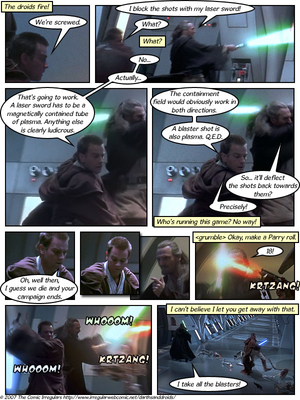 Sorry for the late post, but I just got distracted by something surely most of you already know about, and I’m happy to tell the rest: Darths & Droids. It’s a web-strip of Phantom Menace screen-caps, which has the ludicrously high concept of a bunch of role-players taking on a weird sci-fi adventure in a world where Star Wars never existed. So basically, a reasonable player (Obi-Wan), an XP-and-loot obsessed lunatic (Qui-Gon), a little sister who keeps showing up (Jar Jar), a terrifyingly hardcore gamer with custom dice (Artoo) and a drama student (Shmi/Anakin) traverse a weird world of laser swords and lost orbs and strapping young children to jet engines for profit.