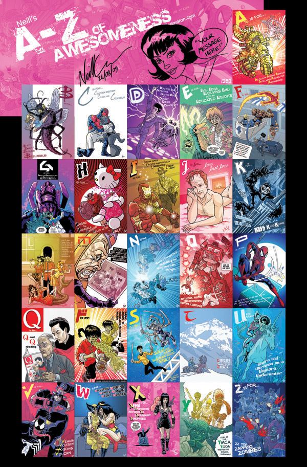 …is on sale! If you follow me on Twitter, then you’ve seen artist Neill Cameron’s A-Z of Awesomeness, a series includes such wonders as Indiana Jones Inching away from an Inebriated Iron Man and Wolverine Wishing Wonder Woman Weren’t So Wasted (I’m pretty sure I passed around J, which features a naked Joss Whedon, as it was the most terrifying). Now the whole thing is available on one poster, which Neill will also sign and sketch on — and can be ordered here. There’s only 250 prints, so… I’d move very, very fast.