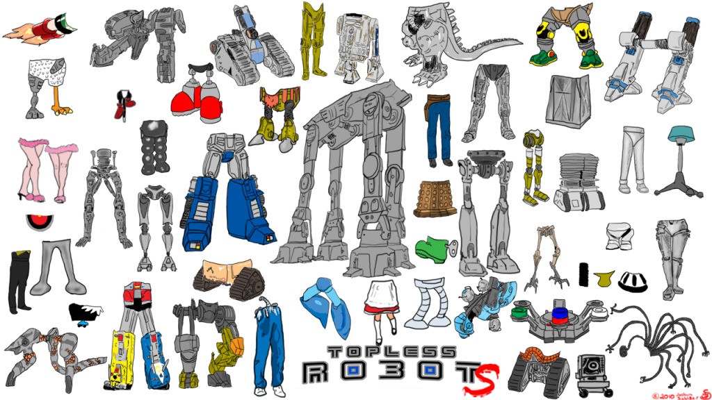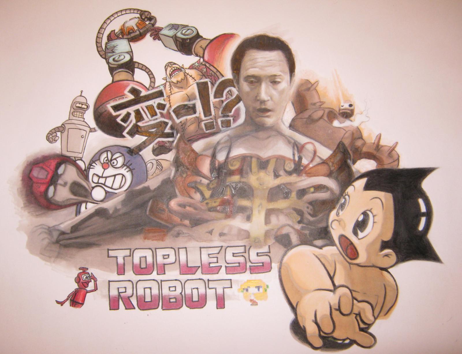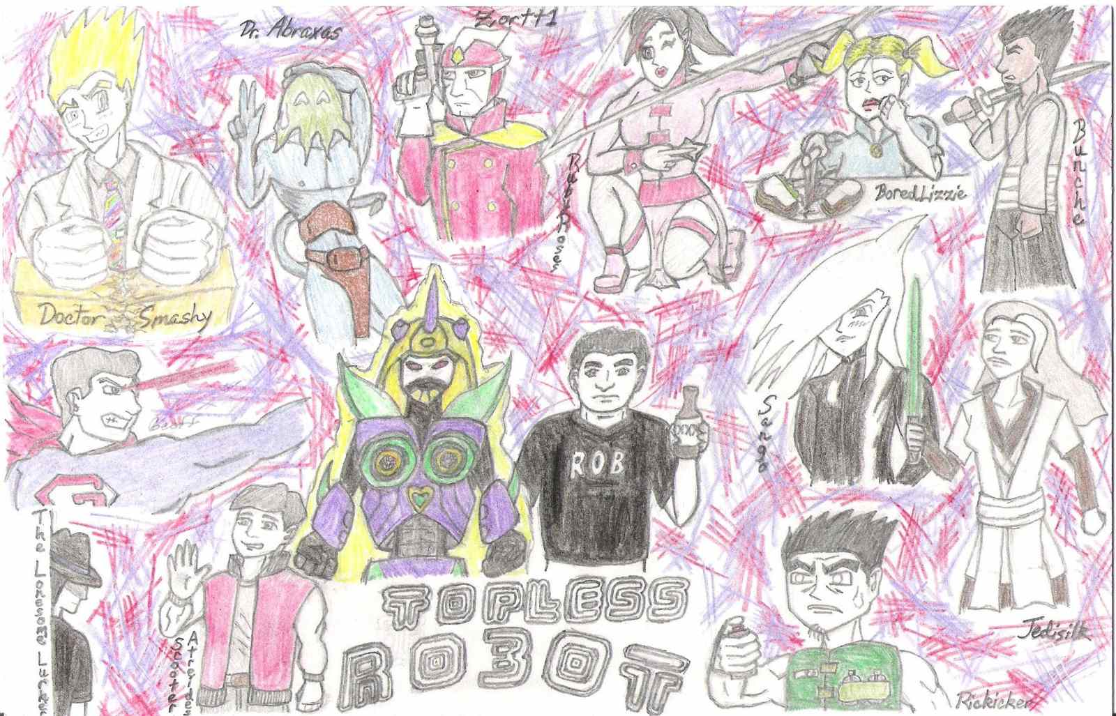 ?One of several drawing of the TR faithful. I’m the one holding hands with the Topless Robot. Note: I’m overweight but not to Buddha proportions, my hair is fine, and I’m drinking. Verdict? Most accurate representation so far.