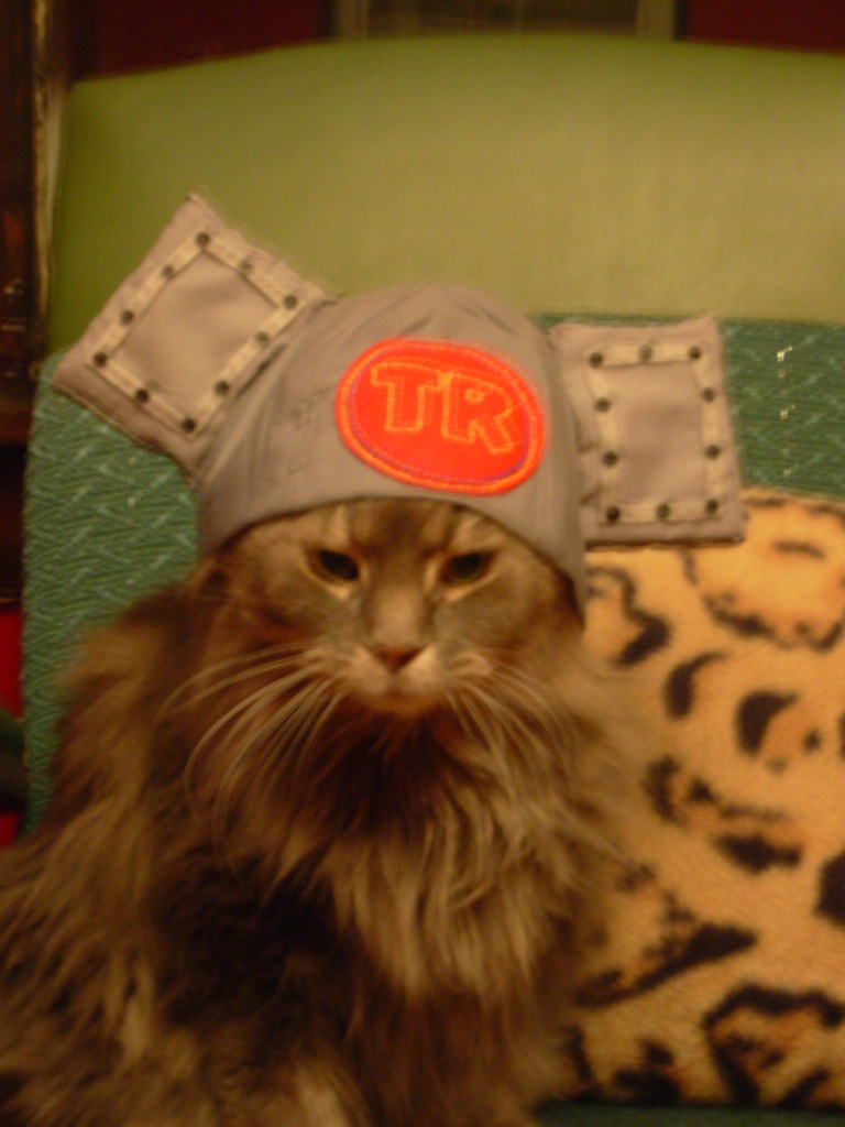 ?Sarah Jane sent in many better pictures of this little TR-adorned hat, but I preferred to run the one where a cat is wearing it.