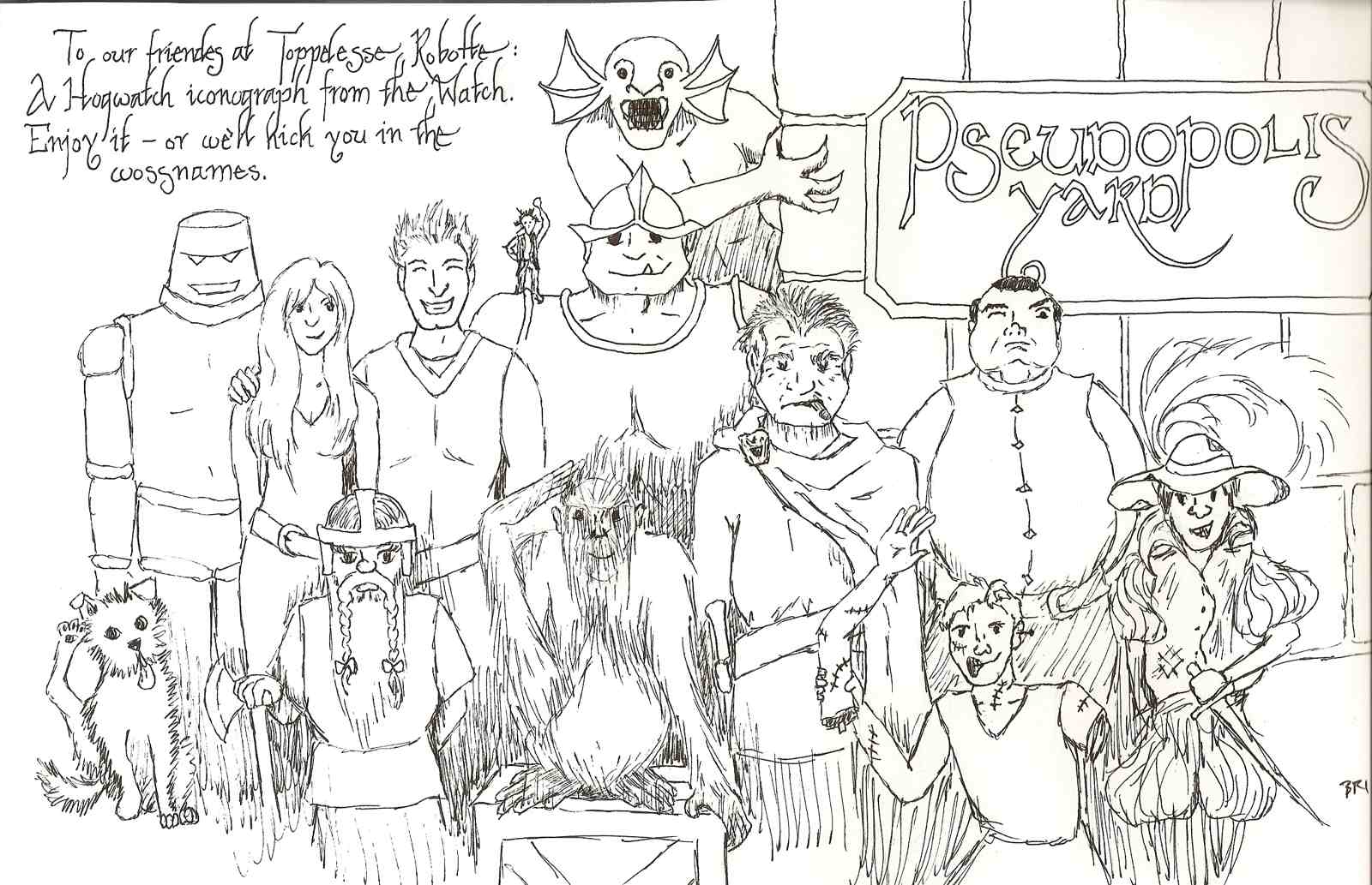 Mythbri drew this amazing group picture of the stars of Terry Pratchett’s book Night Watch. She listed them all out, but I don’t room for it. Maybe she’ll be kind enough to explain in the comments?