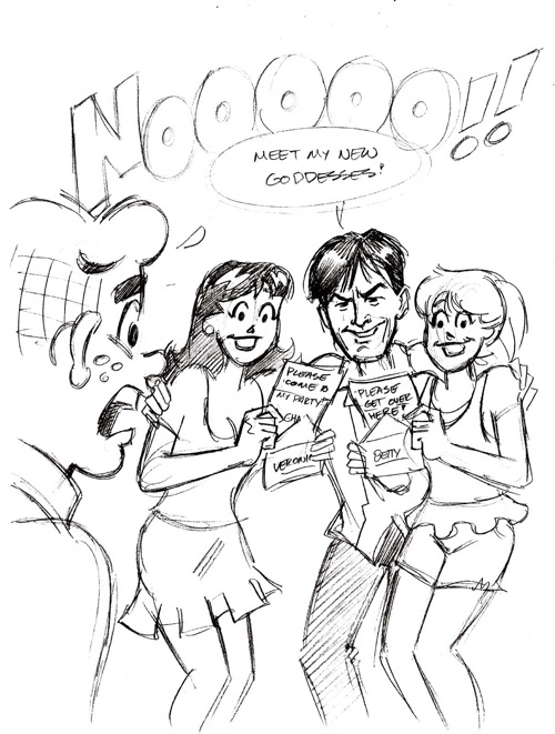 ?? Charlie Sheen’s reign of gnarly terror has finally come to Riverdale. In all honesty, I’m not that surprised. Archie’s been snoozing for over half a century, his losing was inevitable. Also, when Sheen talks about being “bi-winning,” I’m reasonably confident he was talking about nailing both Betty and Veronica exactly. Probably at the same time.