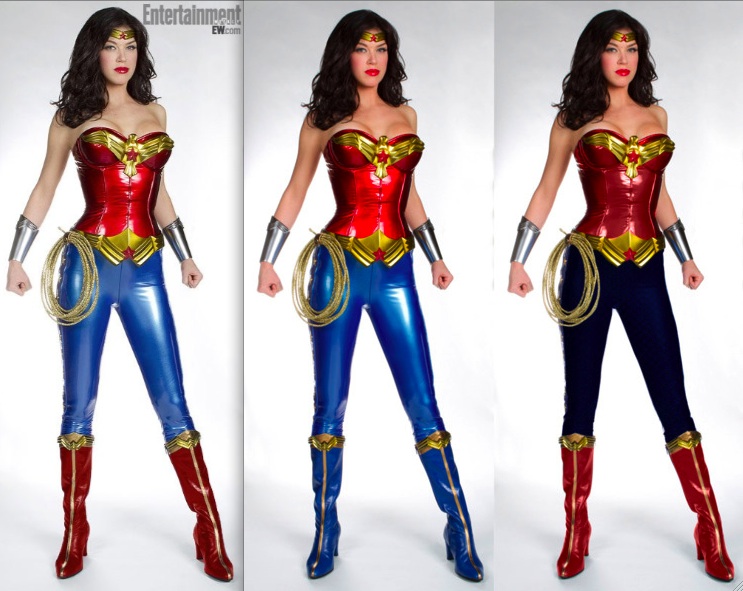 ?And while we’re on the subject of live-action representations of DC superheroes, let’s take another look at the new TV Wonder Woman, whose outfit caused so many people to go batshit insane on Friday. Now, you’ll recognize the official TV costume as the one in the middle above. On the left is a tweaked pic provided by Topless Roboteer Adder, in which the boots have been turned red, which is a massive improvement. On the right is a much more major tweak by this dude — the colors are more muted, the pants much darker (almost but not quite black) and, of course, the boots are also red. Some thoughts: