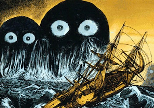 Umib?zu are just one of many sea monsters that terrify sailors in Japanese mythology. Purported to be the disembodied spirits of monks who drowned at sea — as evidenced by their shaved noggins — Umib?zu are described as towering, pitch-black ghosts that accost passing ships solely on the principle that they’re giants and must therefore go out of their way to be complete and utter jerks; that or they really don’t like their moments of prayer disturbed. But rather than go the barbaric route and smash the ship to smithereens, the Umib?zu politely asks if the ship has a barrel on board. If you’re stupid or extremely scared enough to comply with their demand, then you have the honor of watching the towering dirtbag use it to fill your ship with water causing it to sink.