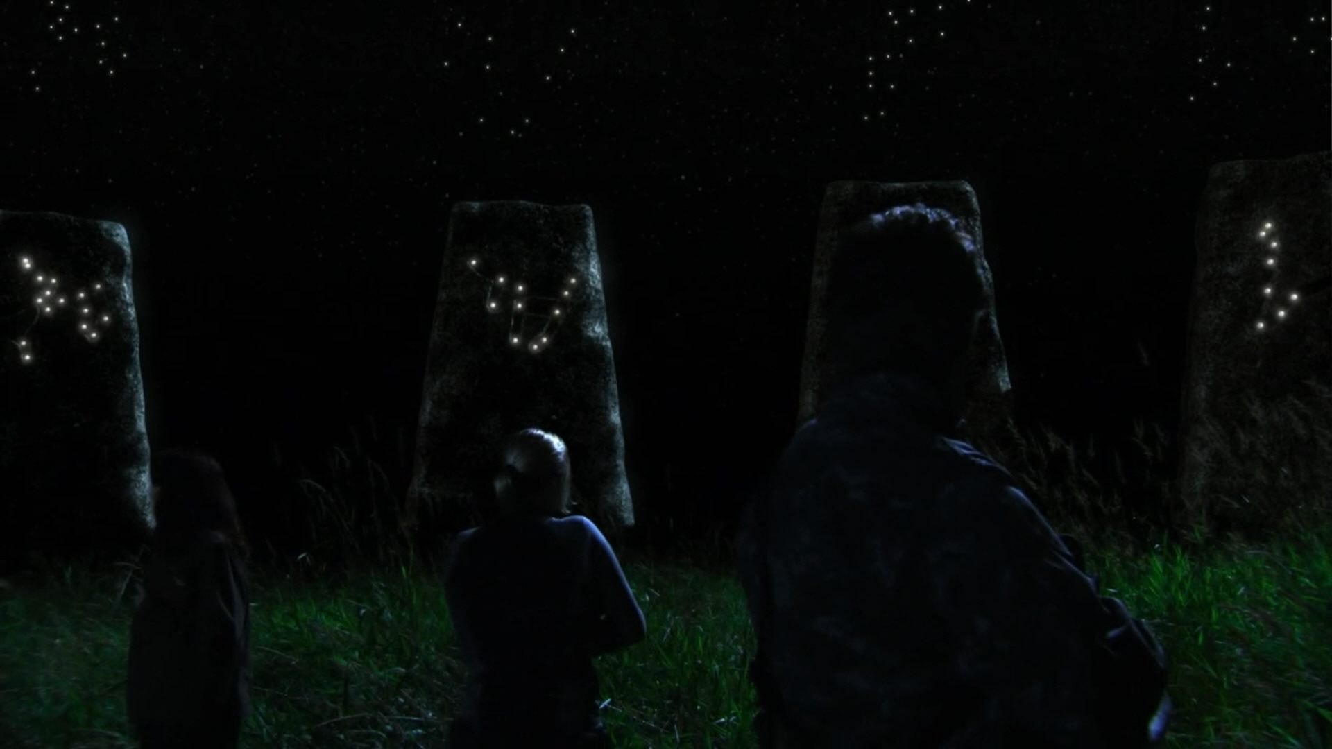 With most of their issues resolved the crew of Galactica searches Kobol for answers in the quest for Earth. When the series began, Commander Adama expressed that Earth was a myth, something to keep the people moving forward. His beliefs change when he recovers from his attempted murder, and joins Roslin, Zarek and others down on the surface of Kobol. Once the pragmatist, he is at least willing to go along with Roslin’s quest, and keeps an open mind for the most part. The expedition arrives at the legendary Temple of Athena, but upon entering it, finds that most of it is crumbled ruins of statues representing the original names of the colonies, which ironically are the signs of the zodiac. When they find a mostly intact statue of Sagittarius missing his trademark arrow, it becomes pretty obvious where the Arrow of Apollo goes. When inserted, the Temple seals shut, locking in Adama, Roslin, Starbuck and others, but when they look around, they are no longer in ruins but are in a field of tall grass, with large Stonehenge looking rocks surrounding them, each with a depiction of a constellation that coincides with the names of the colonies. After pondering for a few minutes they discover the truth, they are not looking at a map to Earth; they are standing ON Earth, at least a representation of it.