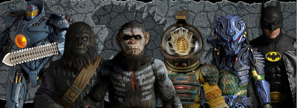 NECA’s Toy Fair banner reveals a facehugged Kane from Alien (John Hurt, apparently more than willing to sign off on his likeness for Doctor Who toys, does not want an Alien figure that looks like him) and a silhouette of the new movie Godzilla they’re not allowed to reveal yet.